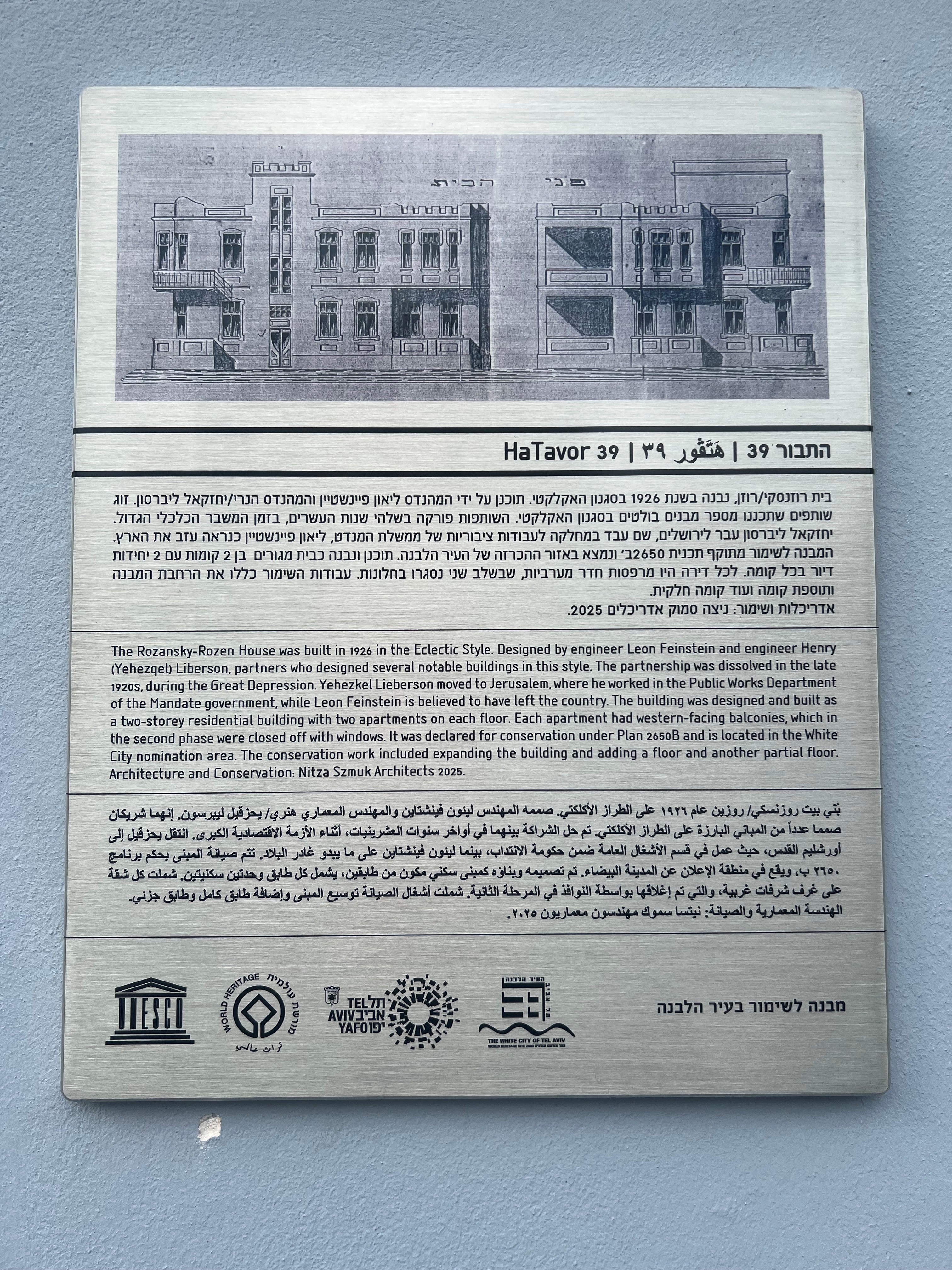 המבנה ברחוב התבור 39 פינת רחוב שפ"ר, נבנה עבור משפחת רוזנסקי/רוזן, במחצית השנייה של שנות העשרים לפי היתר בנייה משנת 1925. הבית תוכנן עבור 4 משפחות ונבנה על אדמת כרם משראוי במגרש מספר 27/3. האזור נמצא מזרחית לשכונת מנשייה הערבית, שנהרסה כליל ב-1948. שנת הבנייה 1926 מסמנת את תחילת המשבר הכלכלי שהחל בארץ בעקבות פיחות הזלוטי הפולני והפסקת העלייה. תכנון החזיתות העשיר, המופיע בתוכניות להיתר, של המהנדסים השותפים הנרי ליברסון וליאון פיינשטיין, לא בוצע במלואו. חסרים בפועל מסגרות מעוטרות מסביב לכל הפתחים, קרניזים, שקיעות והבלטות בכל החזיתות. התלת מימדיות של החזיתות, המושגת באמצעות הארקרים ומרפסות הפינה, מפצה במעט על העדר דקורציה. ההפשטה של החזיתות היא כנראה פועל יוצא של בניה בשעת מחסור כלכלי. בכל דירה תוכננה מרפסת חדר הפונה מערבה, אשר היתה בסמיכות למטבח ובו סעדה המשפחה לאחר יום עבודה, כשהיא נהנית מהבריזה המערבית. מרבית קירות חללי הפנים מעוטרים בציורי קיר ברמה בינונית ואפשר לומר אפילו מינורית. לפעמים העדר עיטורים מפוצה על ידי צביעת הקירות בצבעים עזים. כל חללי הפנים מרוצפים בריצוף מעוטר אשר נשמר ברובו ברמה גבוהה. בחדר המדרגות נעשה שימוש במדרגות יצוקות מבטון של בית החרושת הטמפלרי וילנד. הבית נשאר ברובו לא מאוכלס במשך שנים רבות, ולכן נשמר כפי שנבנה במקור.